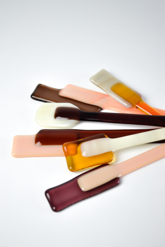 Glazen lepels om te smeren en te roeren. De lolly's worden gebruikt voor kleurrijke borrelplanken of om je koffie of thee mee te roeren. Allemaal handgemaakt in Nederland.